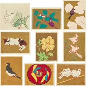 花・虫・鳥・猫・風景など、熊谷らしいモチーフが、非常に簡潔な線と色で描かれています。