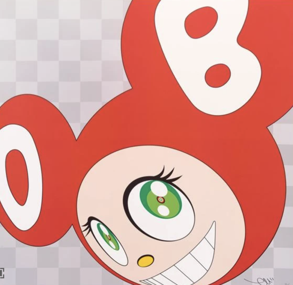 1993年に誕生したオリジナルキャラクター“Mr. DOB”は、ミッキーマウスやアンパンマン、ドラえもんといった日本的キャラクターの記号を再構築したような存在。村上自身の“分身”ともされ、ポップでありながら複雑な内面や文化批評性を内包したシリーズです。市場でも安定した人気があり、特に大型作品や箔押し仕様などは数十万円以上の評価がつくことも。